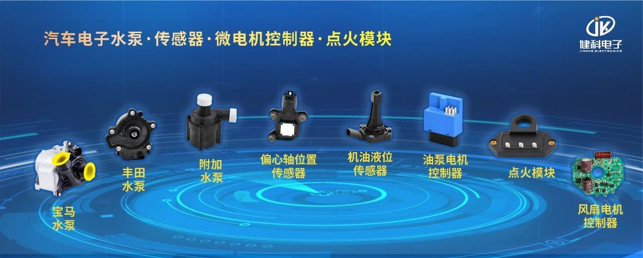 健科電子目前有深圳和長沙兩處生產基地,公司一直專注汽車電子相關產品的技術研發及產業化,為全球OE及售后市場提供多樣式、定制化的汽車電子產品。 健科電子水泵、傳感器、點火模塊都有多款產品適用于日韓德系車,這次我們展示了豐田水泵WPT190和G902047031,寶馬水泵11517632426,奔馳水泵A2048350364;傳感器12617607910,03C907660H,11377524879, 11377527016;控制器模塊1K0906093K, 253854D900以及點火模塊J121,J152 , 8962135020, 2202060A21等產品。