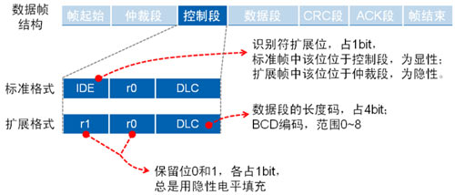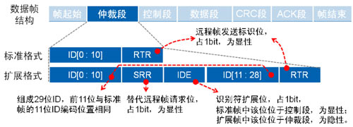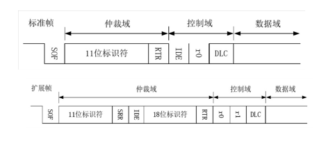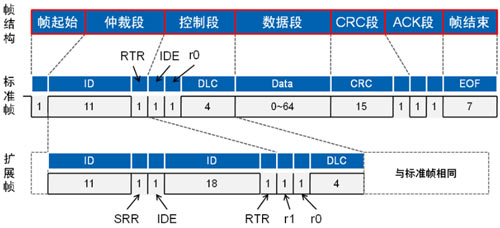 與數據幀相比,遠程幀結構上無數據段,由6個段組成,同 理分標準幀格式和擴展幀格式,且RTR位為1(隱性電平)。