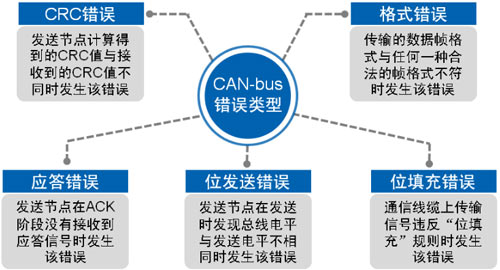 盡管CAN通訊的可靠性很高,但是依然可能出現錯誤。錯誤類型有一下五種。