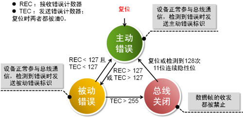 為防止自身由于某些原因導致無法正常接收額節點一直發送錯誤幀,干擾其他節點通信,CAN BUS 規定了節點的3種狀態及其行為。